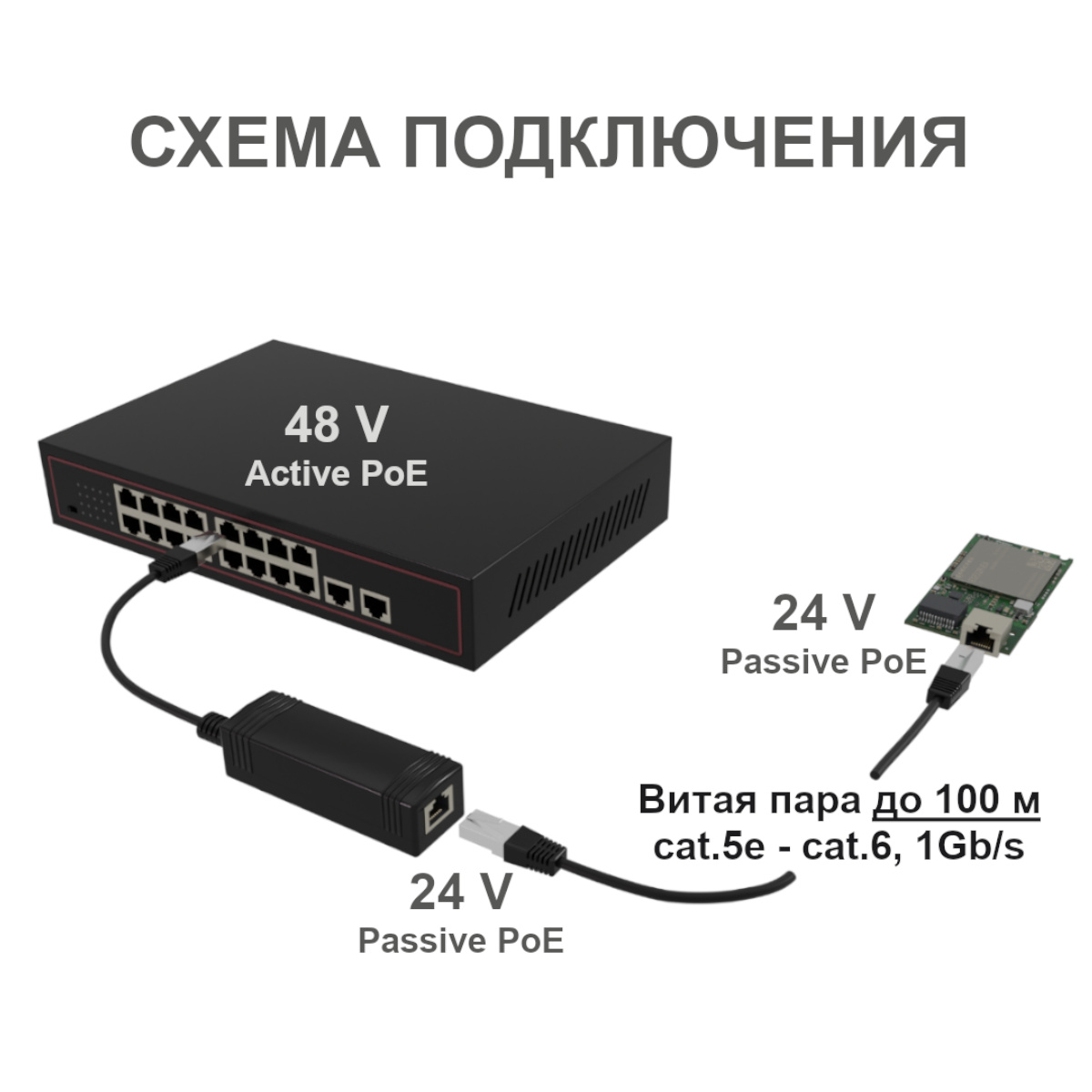 - Технология подачи питания и данных по одному кабелю Passive POE 24 В.