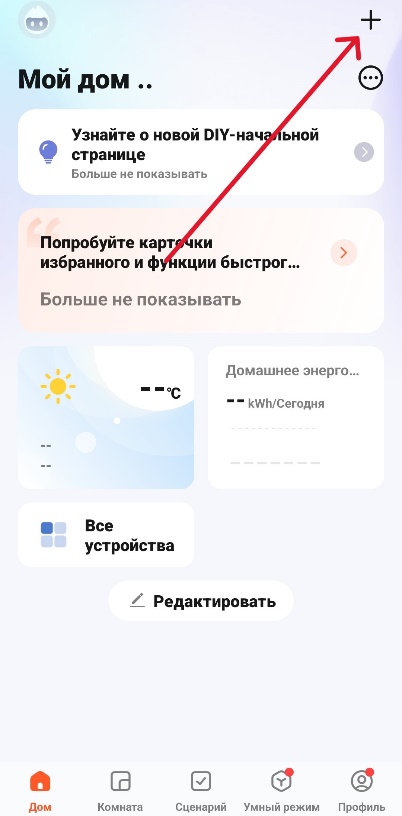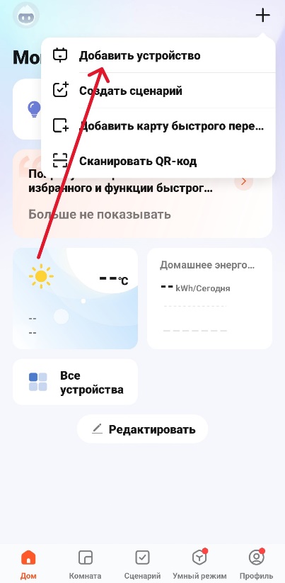 3 Во вкладке Дом нажмите на плюс (а), в правом верхнем углу, после чего нажмите на пункт Добавить устройство (б).