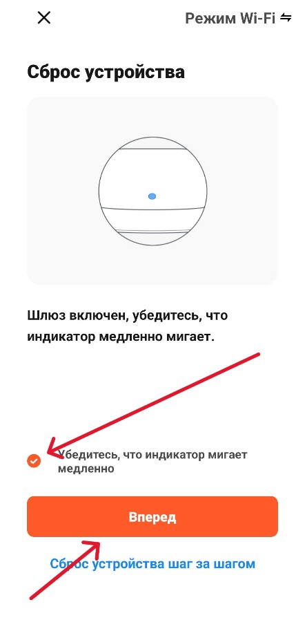 Убедитесь, что устройство сброшено к заводским настройкам (для этого зажмите кнопку Reset на 5 секунд (световое кольцо должно быстро заморгать красным)).