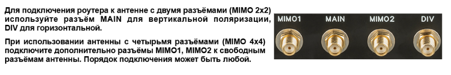 - Проверьте подключение кабельных сборок либо антенн (2-4 шт., могут не идти в комплекте) к портам MAIN|DIV|MIMO1|MIMO2|AUX1|AUX2. Приоритетно подключить MAIN и DIV.